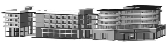 A dimensional survey (Survey and 3D modeling of the building, Figure 4) and the project’s (Figure 5) verification were carried out. The building presents the following characteristics: a height of 25 m, total floor surface 21,000 m2, and site area 29,150 m2. The structure consists of piles molded in situ, reinforced concrete pillars, angular beams, and reinforced concrete slabs. The elevator and the stairs are made of reinforced concrete. The masonry is made of ceramic brick. The roofs are flat with infiltration slabs.