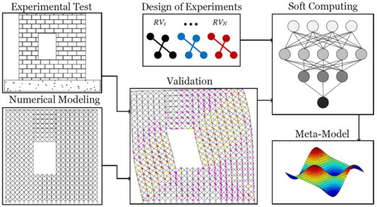 In this research study, the multi-pier (MP) approach, as a discrete element method (DEM), was employed and the results were compared using the outcomes of the previous studies. The MP was originally developed by Pirsaheb et al. [31,32]. This approach can determine both the in-plane and out-of-plane non-linear general responses of masonry walls, regardless of their shape, subjected to various loading conditions with acceptable accuracy and simplicity. A specified assemblage of vertical and diagonal trusses, which substitute for a real masonry wall, are able to exhibit the non-linear behavior of structures through one-dimensional elements. The effect of the area and shape of the opening on UMW behavior was determined using the MP method. The results of the applied MP method were used to train the artificial neural network (ANN) to achieve more accurate results, along with developing a practical equation for predicting the effects of the opening. This paper combines two different branches of science (i.e., numerical modeling and soft computing) to address a complex problem. Figure 1 is a flow chart of the activities/tasks performed in this study.