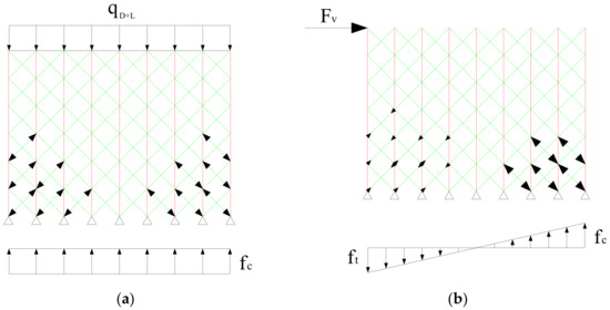 For considering the effect of lateral loads, Figure 2b shows how the lateral loads divide a masonry wall into two tensile and compression regions. The compression stresses will appear in the braces due to the application of gravity loads. The tensile stress due to the lateral load in the tensile region decreases as shown in Figure 2a, because of the pre-compression in the wall. On the contrary, the pre-compression causes an increase in the compression stress of the braces in the compression region. The tensile stresses in the left hand side of the wall in Figure 2b induce tensile cracks in a masonry wall. Toe crush may be seen in the right hand side due to the compression stresses and an increase in these stresses due to lateral loads. The active mechanism which arises in the equivalent system due to distribution of the aforementioned stresses in the braces enriches Mohr–Coulomb’s law.