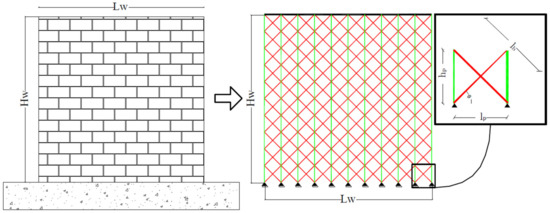 The truss method is a simple, practical, and time-saving approach which replaces the macro method. This procedure is in accordance with the Holmes diagonal tension concept [33] and has been analyzed in a few previous research studies [34,35,36,37,38,39,40,41,42,43], has attracted the attention of practitioners. The idea of this method is, basically, to rely on simplifying the problem of a masonry wall, which is basically two dimensional, to the assemblages of axial members. This method can be utilized with less effort and provides the capability to implement a simple one-dimensional failure criterion for truss elements, leading to its appeal in standard practice. This method is applicable for the design and analysis of retrofitted masonry buildings by determining the required global responses of the structure (e.g., post-peak response, patterns of local cracks, maximum displacement, and load-bearing capacity) [31].