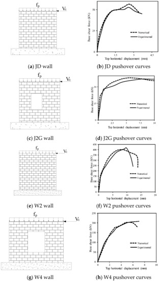 Two different masonry walls of 240 mm thickness constructed using Chinese codes were selected to verify the MP method results. The dimensions of the walls were 1990 × 1490 × 240 mm and a constant vertical pre-compression of 0.3 fcm was applied on the top edges using a rigid concrete beam. fcm is the compressive strength of the masonry unit and was equal to 10 MPa the in study of Peng et al. [48]. Therefore, the pre-compression of these models was 3 MPa, which is a relatively high pre-compression. W2 (Figure 4e) is a masonry wall without an opening and W4 (Figure 4g) is the same wall with a central opening of 630 × 760 mm, representing an opening area ratio of 16% [48].