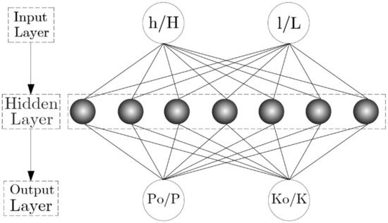 Abiodun et al. [62] defined modeling the network as presenting a real-life object or phenomenon using mathematical-based expressions. It is important to determine the optimum configuration of a network that provides well-set and high accuracy at the same time. Considering the fact that there is no equation to specify the number of hidden layers or neurons located on a specified layer, such a number was determined with trial and error. The best possible architecture was selected using the presented ANN model according to the test results of various types of structures containing different neuron and hidden layer numbers attributed to a specified layer [63]. It was observed that the network with a single hidden layer containing seven neurons had the best performance for anticipating the load-bearing and stiffness of the perforated masonry wall containing a central opening. The optimal architecture of the networks is shown in Figure 5.