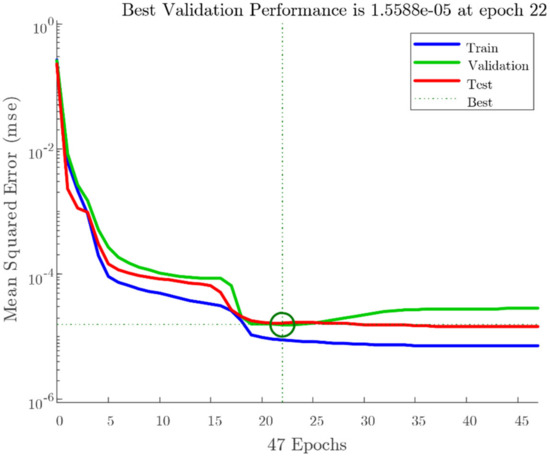 The ratio of the load-bearing capacity of a perforated masonry wall to a solid wall, and its stiffness ratio, can be predicted once the network is trained. In addition, the complex relationship between the input parameters can be determined. The performance of the networks in evaluating the response of masonry walls is shown in Figure 6. The best validation performance was obtained as 1.55 × 10 × 5 at the 22nd epoch. The occurrence of overfitting is ruled out because the validation curve remains constant. Thus, no changes need to be made to the training process, network architecture, or the dataset. Figure 7 shows a strong correlation between the target (numerical results) and ANN output according to the correlation coefficient (R) for all data. The total response with R values close to 1 confirmed that the network calculated the outcomes with good accuracy.