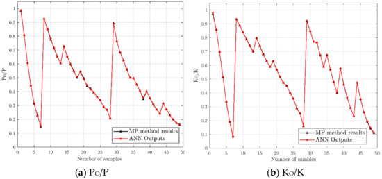 The ANN technique was applied to the dataset. In this soft-computing method, 70% of the data are included in the training procedure of the meta-model, while the rest are used equally for validation and testing. Several metrics are used for error evaluation: mean absolute percentage error (MAPE), mean square error (MSE), Nash–Sutcliffe efficiency (NSE) coefficient, root mean square error (RMSE), mean absolute error (MAE), along with the coefficient of determination (R2) (see Equation (11)). These metrics are listed in Table 4 for the ANN soft-computing technique. The ideal value for MSE, RMSE, MAE, and MAPE is zero, while its unit for NSE and R2, where , and are individual outputs, the estimated output, and the mean value, respectively. The predicted results using the ANN model are compared with those produced by the MP method in Figure 9. As can be seen, the results of the network are in accordance with the analytical results. The error of the prediction for both the load bearing capacity and initial stiffness are listed in Table 5, based on six different statistical measurements. The MSE of the ANN for predicting the load bearing and initial stiffness ratio are 1.58 × 10−5 and 6.05 × 10−6, respectively.