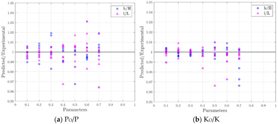The suitable accuracy of the results, as well as the similar contribution of the input parameters in the network, allow the implementation of the ANN models to predict the numerical results, and at a higher level, propose a formula for the estimation of the reduction in load-bearing capacity and initial stiffness due to implementing a central opening. For this purpose, the number of network inputs was increased to 1308 to cover all possible situations in creating a central opening in the masonry wall. The formula uses the biases and weight values of the ANN model to evaluate the response of the analyzed masonry wall. The generation of empirical equations can reduce the limitations of neural network use. The pattern formula applied here for anticipating the behavior of a masonry wall was introduced by Leung et al. [69]. To determine an empirical formula, the most effective parameter on the output was kept constant in its reference value, i.e., its median, and outputs of the network for the variation of other inputs were obtained. Using the curve fitting tools in MATLAB, a line of best fit in the least square error method can be determined. It is assumed that the variation of the load-bearing capacity and initial stiffness with each parameter is independent of the other parameters, and can be expressed as Equations (13) and (14), respectively. In Equation (13), PO/P is the ratio of the load bearing capacity of a perforated masonry wall to a solid masonry wall, h is the opening height, l is the opening length, H is the wall height, and L is the wall length. In Equation (14), KO/K is the reduction in the initial stiffness of the perforated masonry wall compared to the solid wall.