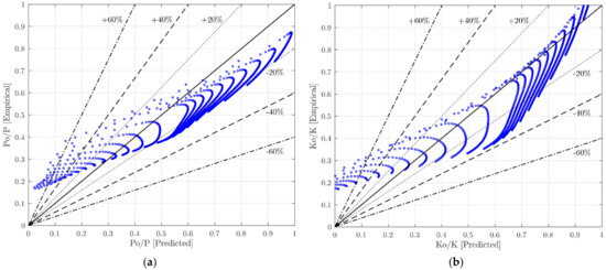 Predictions of (a) PO/P and (b) KO/K in proposed formula.