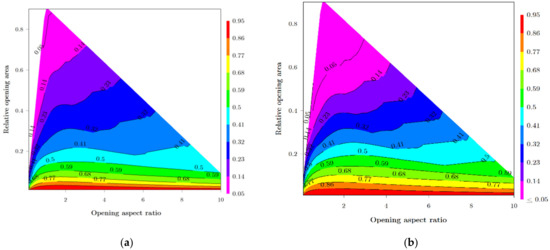 Reduction factors based on opening area and aspect ratio for (a) load-bearing capacity and (b) initial stiffness.