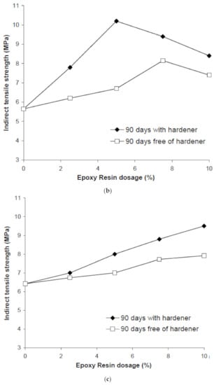 Indirect tensile strength of EMGs, with and without a hardener at 90 days of curing: (a) G1; (b) G2 and (c) G3.
