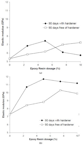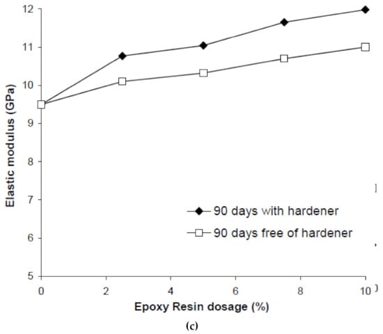 In total, the results of the test conducted in the current study showed a remarkable improvement of the elastic modulus, after the addition of AR or ER (with or without a hardener). This outcome is interesting in light of the fact that it is contrary to the outcomes obtained from past research [24,61], which postulate that polymers generally reduce the elastic modulus of cementitious material. In contrast, the results of the current study are in agreement with other studies [39,62] which demonstrate that polymer-modified cementitious materials tend to exhibit a higher elastic modulus than the unmodified material.