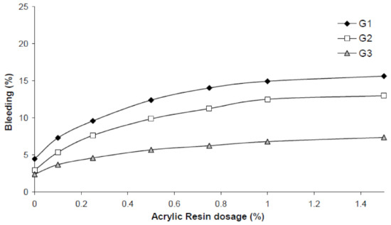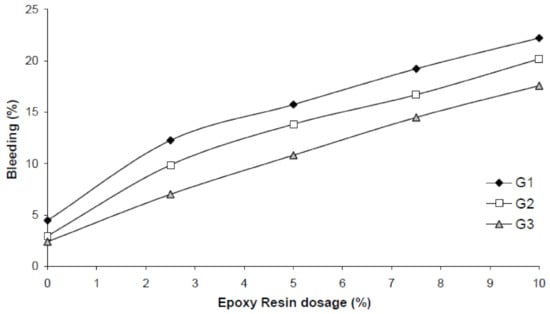It is easily noticeable that the addition of ER or AR substantially increased the bleeding of all of the grouts. The increase in polymer content resulted in an analogous increase in bleeding. Bleeding was more pronounced in the case of ER and for the thinner grouts. These results contradict previous research findings [43,61], which concluded that, generally, the volume loss of the modified system is reduced after the addition of polymers. Obviously, the addition of high dosages of polymer (especially ER) and PCE superplasticiser increases the dispersion ability, so the cement mixture entraps less water and, consequently, results in the reduction of the final volume [63]. It should be pointed out that the addition of hardener in EMGs did not seem to affect their bleeding.