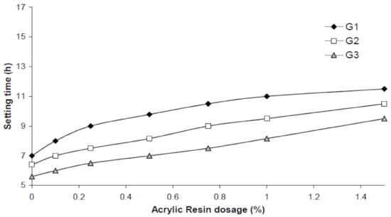 Figure 9 and Figure 10 depict the setting time of the various examined grouts. Apparently, a retardation of the final setting was caused by the presence of ER or AR, in all grouts [64].