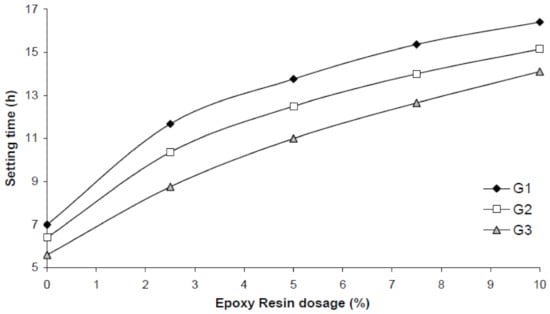 The setting time increased as the quantity of polymer increased. The extension of setting time was more pronounced in the case of ER and for the thinner grouts. However, despite the retardation effect of both polymers, the setting times did not exceed 24 h, which in construction scenarios represents the maximum setting time for grouting [65]. It should be mentioned that the experimental results indicated that the presence of hardener in EMGs did not induce any additional delay of their final setting.
