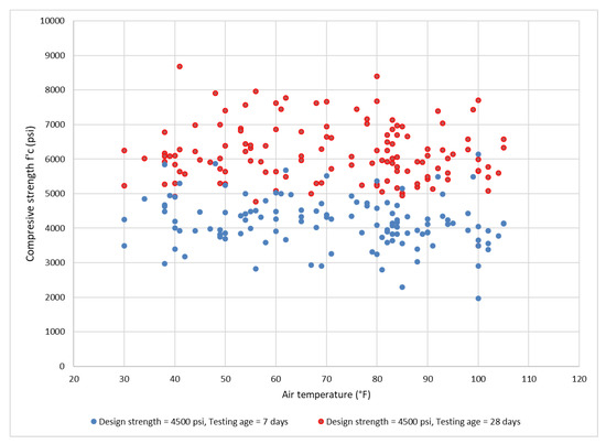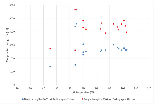 In regards to this relation at a design strength of 31 MPa (4500 psi), there was more data, as illustrated in Figure 2. It can be seen that the compressive strength fluctuated and scattered with the varying air temperature. This trend repeated for both 7 days and 28 days testing ages. It should be noted that although the air temperature reached above 38 °C (100 °F), the obtained strengths were significantly higher than the design strength and all results remained above the acceptable range with regard to local recommendations.