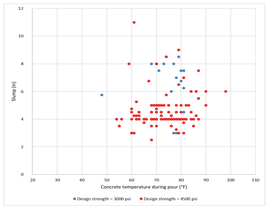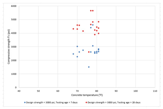 Figure 7 demonstrates the slump test results versus air temperature. A close look at Figure 7 indicates a fluctuated slump results specifically for 21 MPa (3000 psi) specimens. The slump value increased as the air temperature increased from 4 °C (40 °F) to 27 °C (80 °F) and then decreased when the air temperature raised to 38 °C (100 °F). Previous studies demonstrate that the increase in air temperature decreases the workability and, therefore, the slump results for fresh concrete [25,26]. In addition, it seems that the slump value was higher than 10 cm (4 inch), which was the acceptable range. The highest value was recorded at 27 °C (80 °F) air temperature. For 31 MPa (4500 psi) specimens, despite having some scattered slump values above 15 cm (4 inch), for the majority of the specimens, results fluctuated around the acceptable range of 10 cm (4 inch).