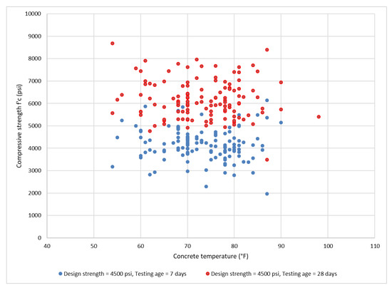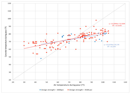 On the one hand, considering the design strength of 3000 psi, using the equation of linear regression, the intersection point between the two functions is at x = 73.2 °F. Similarly, considering the design strength of 4500 psi, using the equation of linear regression, the intersection point between the two functions is at x = 74.2 °F. On the other hand, regardless of the design strength, using the equation of linear regression, the intersection point between the two functions is at x = 74.1 °F. The coefficients of determination in the two regressions for design strength of 4500 psi was about 0.5. In regards to the design strength of 3000 psi, the coefficient of determination was about 0.3. This low coefficient of determination, relative to the larger coefficient obtained for the 4500 psi regression line, can be explained by the fact that there was less data for this design strength. As a result, when either considering or ignoring the design strength, the intersection point was about 70 °F ± 5 °F. In other words, when the air temperature equals 70 °F ± 5 °F, the concrete and air temperatures were approximately the same. When the air temperature was below 70 °F ± 5 °F, the concrete temperature was higher than the air temperature. When the air temperature was above 70 °F ± 5 °F, the concrete temperature was lower than the air temperature.