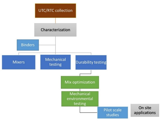 The characterization of the sediments is the first step in any recovery process. It allows the determination of a set of properties necessary to choose a valuation chain to optimize this process. Once the necessary characteristics have been identified, laboratory scale testing is the next step. along with the selection of suitable ecofriendly binders. Mechanical and durability testing indicate whether self-compacting mortars are suitable for use in pilot scale experiments. If mechanical testing does not yield promising results, repeat the laboratory scale experiments with different binders at higher doses or with excavated soil pre-treatment before adding ecobinders. Real-time experiments are the final stage of any excavated soil recovery process. Figure 3 provides the strategy for reusing trench-cuttings, i.e., rural (RTC) and urban cuttings (UTC).