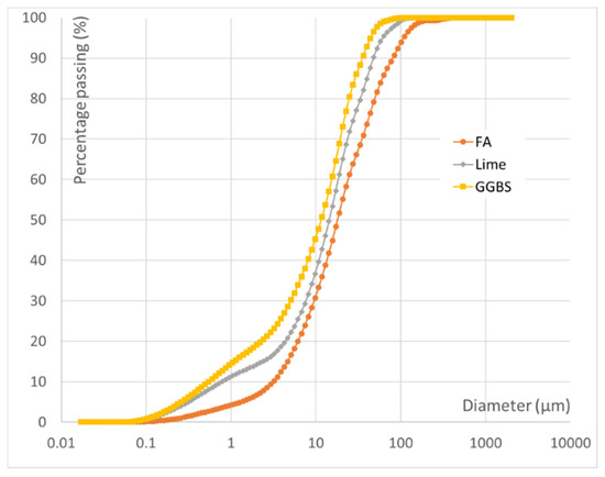 The first concern is the selection of the ecobinder, i.e., low carbon binder. Many studies [13,14,15] on the excavated material to be reused for construction works have shown that the addition of a hydraulic and/or pozzolanic binder can fulfill the required mechanical characteristics criteria for the material to be used as road construction. However, the chemistry of trench cutting is very complex and variable. The trench cuttings are very heterogenous depending on the origin (rural or urban) of the working site. Therefore, the type of binder and its amount requires making them feasible for use as construction materials. The incorporation of industrial by-products such as fly ash (FA) and ground granulated blast-furnace slag (GGBS) instead of ordinary Portland cement (OPC) seems interesting, as it allows the co-valorization of two wastes (dredged sediments and industrial by-products) and, thus, can eliminate them both. Pozzolanic binders (with alkaline activator) can evince mechanical properties [16] and thermal stability [17,18] compared to OPC. Three types of ecobinders used in this study are presented in Table 1. Additives are anhydrous products.
