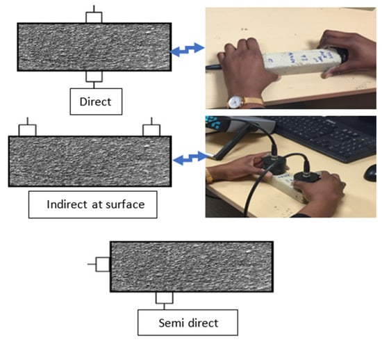In civil engineering, ultrasonic techniques are not only widely used for the control of ordinary concretes but also for special mortars or cement-stabilized soils such as self-compacting (case of our study) and ultra-high- performance fiber concrete [19]. The method consists of measuring the pulse velocity of the ultrasound passing through the material using a generator and a receiver (transducers). It is now possible to make measurements on site using portable hardware such as PUNDIT (Portable Ultrasonic Nondestructive Digital Indicating Tester), which was used in this study. The measurement is essentially based on the transmission of ultrasonic waves and the measurement of its transfer time. Three types of configurations of two transducers can be used and are illustrated in Figure 5: (a) direct, (b) indirect at surface, and (c) semi-direct.