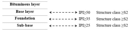To reuse excavated soils or sediments for road construction, it is necessary to understand the specific requirements for road construction defined by the federal or local authorities of that area. As per French standard, a minimum and a maximum unconfined compressive strength (UCS) are recommended: a minimum 2 to 4 MPa to ensure the bearing capacity of vehicles and a maximum ≤8 MPa to ensure their re-excavation for base layer, while for the foundation and sub-base, the UCS should be ≥1 MPa. To reuse TC for road construction, a minimum unconfined compressive strength of 2 MPa is needed. Other than that, Proctor and tensile strength tests are also recommended by French rules and regulations for road construction. To obtain the required strengths, the excavated soils must be treated with a high proportion of pozzolanic/hydraulic binders, as made in soil stabilization techniques. The Proctor test evaluates the compaction properties of excavated materials (European Standard, NF EN 13286-2, 2005). The immediate bearing capacity (IPI index), which determines the capacity of a material to support the circulation of the building machines under construction, is also recommended (European Standard, NF EN 13286-47). The recommended characteristics for the different road layers as specified in French standards are provided in Figure 7 [22].
