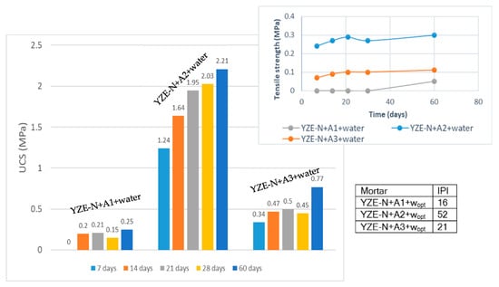 UCS and tensile strength results for Yzernay TC mortar with all three ecobinders.