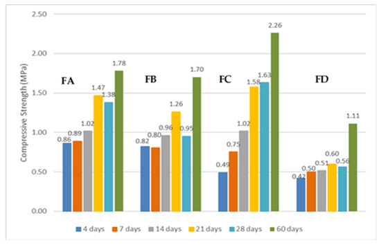 The TC in this section is from a trench site operating on the side of a road for gas pipeline installation. Both Yzernay and Villeray TC were classified as RTC because they were excavated from the side of a road. It has already been determined that the A2 ecobinder is particularly effective for various types of TC. The question now is how much binder should be used to achieve the maximum possible strength for this type of TC. Four combinations have been proposed for SCM optimization. The ecobinder (A2) dosage was gradually increased by weight from 10% (ref. FA) to 12% (ref. FB), 14% (ref. FC), and 16% (ref. FC) (ref. FD). The water content of each formulation was kept constant. The outcomes of the testing are presented in Figure 14.