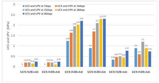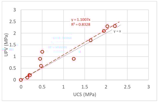 The aim of double testing (destructive and non-destructive) on same samples was to increase the reliability of the compression resistance values. There is a very good agreement between the compressive strength and ultrasonic pulse velocity resistance. It can be observed from the results that the NDT method is reliable and provides results very close to destructive methods, as illustrated in Figure 16. A slight overestimation is observable. Figure 17 explains the relation between UCS (compression strength through direct method) and UPV (compression strength through indirect method) for YZE + A2.