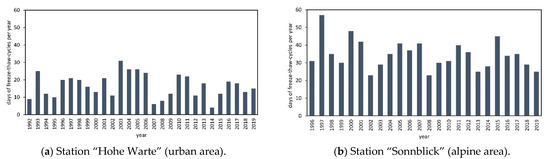 Figure 3a,b show the number of days with a freeze-thaw cycle for every year within the period of observation. Moreover, Becsi and Laimighofer [25] analysed the current climate for Lower Austria and Vienna for the years 1981–2010. An average of 15–20 freeze-thaw days per year was identified for the “Hohe Warte” measuring station, while a frequency of 10–30 freeze-thaw days per year was observed in the peripheral areas of the urban area. For the alpine area, as shown in Figure 3b and using the same temperature range as mentioned above, a significantly higher number of freeze-thaw cycles per year can be identified, resulting in a mean value of 35 freeze-thaw days with a maximum of 58 days in 1997.