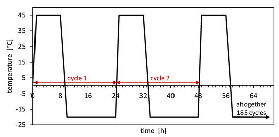 The 50 freeze-thaw cycles must be performed in a suitable climate chamber. A freeze-thaw cycle consists of two parts and is continued immediately after its completion: (1) increase in the internal temperature of the climate chamber to +20 °C (±2 °C) within one hour; this temperature is maintained for 7 h; (2) decrease the internal temperature of the climate chamber to −20 °C (±2 °C) within two hours; this temperature is maintained for 14 h, as it is shown in Figure 1.