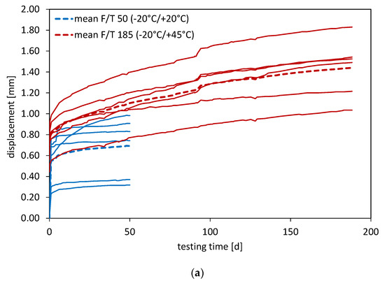 The results of these tests, as described in Section 2.1, are discussed in detail in the following. Figure 7a shows in graphical format the displacement measurements of the test procedure with 50 freeze-thaw cycles (blue lines), which was carried out according to the parameters given in EAD 330499-01-0601 [3].