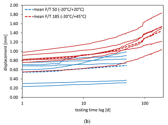 (a) Measured displacements during the 50 freeze-thaw cycles between −20 °C and +20 °C (blue lines) and during the 185 freeze-thaw cycles between −20 °C and +45 °C (red lines); (b) measured displacements in a semi-logarithmic scale of the testing time.