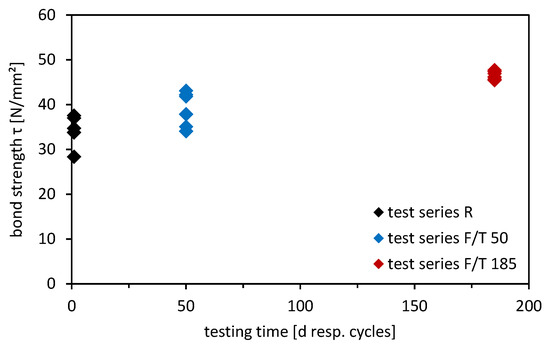 In addition, reference tension tests with a confined test setup were performed after at least the specified curing time of the bonded anchors was achieved. These tests were not loaded constantly before the tests were carried out and can be used to determine any influence of the freeze-thaw cycles on the load-bearing capacity. The average ultimate load was determined with Fum = 77.7 kN (CV = 9.5%), with a displacement at the loss of adhesion of δFu = 1.8 mm. Figure 8 shows the determined bond strength values as a result of the measured residual loads from the different test series. It is shown explicitly that with an increasing age of the bonded anchor, the bond stresses also increase. Due to the fact that a reduction of the bond stresses does not occur, it cannot be concluded that a degradation of the material occurs due to the freeze-thaw exposure for the tested epoxy-based bonded fastener. Furthermore, it can also be observed in Figure 8 that as the curing time increases, the epoxy mortar tested shows higher bond strengths as a result of the post-curing of the adhesive mortar. It may be mentioned as a recommendation that for direct comparison it would also make sense to carry out the reference tests with the same curing time as the freeze-thaw tests at the end of the cycles.