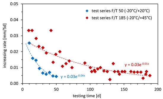 Development of increasing rate of the measured displacements per 5 days in the freeze-thaw tests for different testing protocols.