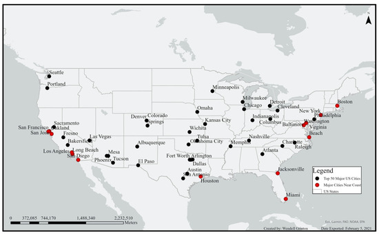 Storm surge places America’s coastlines at risk of being damaged by floodwaters. More specifically, illustrated in Figure 1 below, 14 of the 50 largest cities in the United States, indicated in red, are located on or near coastlines. Over time, coastal communities developed around ports. Cities in coastal communities provided many attractive benefits, for example, cultural exchange, transport, and job opportunities [6]. Historic data also points to more people moving to major cities, placing those individuals at a greater risk of being impacted by intensified natural disasters (e.g., storm surges). Namely, in 2017, more than 94 million people (29.1 percent of the US population) lived near coastlines—a 15 percent increase since 2000 [7]. To keep coastal residents safe and informed during natural disasters, FEMA’s emergency response system, otherwise known as the Integrated Public Alert and Warning Systems (IPAWS), is currently being used [8]. IPAWS sends wireless emergency alerts (WEAs) to residents located within the high-risk area of the disaster. WEAs can be used to effectively deliver emergency response information to residents, especially marginalized residents (e.g., residents of color, elderly residents, impoverished residents, and disabled residents), as such individuals have historically suffered the most from such disasters [9].