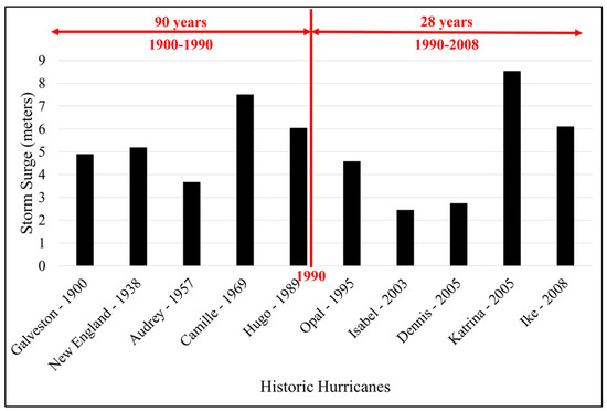 Understanding society’s vulnerabilities to storm surge events is critical because this change can help foresee and limit future storm surge risks and improve the public’s resilience to storm surge events [14]. Since 1900, more than 8 thousand people were killed, and 1.5 million people were affected annually by storm surge events [14]. In the future, the impacts of storm surge events on coastal communities will be magnified by the increasing density of urban areas. For example, previous hurricanes, shown in Figure 3 below, produced storm surge flooding that ranged from 2.45 to 8.53 m above sea level. These storm surge events wreaked havoc on coastal communities and generated billions of dollars in damage that these communities were left to repair.