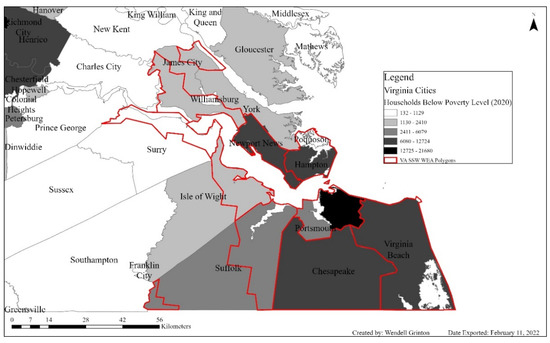 Figure 6 above highlights the geolocation of SSW WEAs in association with poverty-stricken coastal Virginia cities. The color of the cities varies based on the number of households below the poverty line. The lighter shaded cities are cities with the lowest number of households below the poverty line, while cities with the highest number of households below the poverty line are shaded black. Cities, such as Norfolk (19.2 percent), Williamsburg (15.9 percent), and Portsmouth (15.8 percent) contained the highest percentages of households below the poverty line. Contrastingly, cities such as Poquoson (5.1 percent), York (5.7 percent), James City (7.3 percent), and Virginia Beach (7.6 percent) contained the lowest percentages of households below the poverty line.