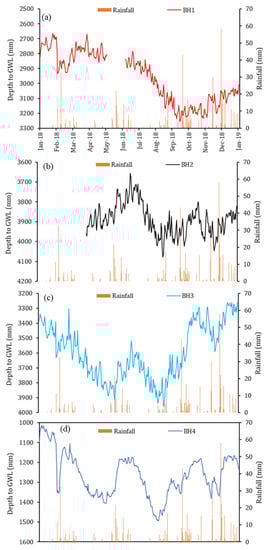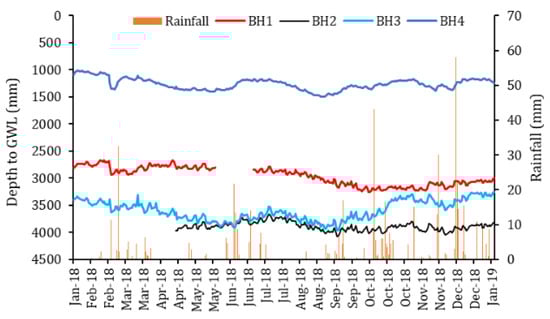The daily groundwater-level fluctuations of all four boreholes and daily rainfall data obtained from BOM site location number 066161 [32], over one year, is shown in Figure 2. The water table depth (WTD) from ground surface in BH1 could be described as having two major stages—an increasing stage until September and a gradually decreasing stage until the end January. The water table depth was highest in September compared with both the beginning and end of monitoring period. The end of water table depth is higher than the beginning of water table depth by about 219 mm. During dry season (May–September) the water table depth increased rapidly despite having some rainfall events which were of small magnitude. In the case of wet season, the water table depth showed a constant level between September and November and continued with a rapidly decreasing stage during many rainfall events with high magnitudes that occurred in the wet season. The annual variation of groundwater level is 594 mm. As shown in Figure 3, GWL variations were rapid and erratic. This may be attributed to the lateral groundwater flow conditions. No major recharge structures (such as leaking water and wastewater and large lake) or extraction facilities exist in the region. It can be said that the overall response of groundwater level to rainfall depicts a distinctive pattern for BH1 (Figure 3a) as the groundwater fluctuation exhibited smooth seasonal change.