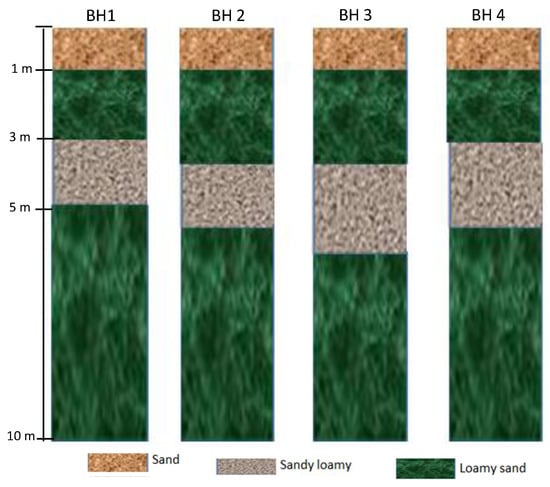 The results obtained from the sieve analysis and sedimentation tests were used to classify the soil samples according to Unified Soil Classification System (USCS) and United States Department of Agriculture (USDA) [46] textural soil classification. Figure 5 shows the combined soil profile at the four boreholes and the variation of the soil texture at different depths. The texture of the soil across the four monitoring sites at a depth of 0–1 m is generally made up of sand. All 4 boreholes exhibited similar soil profiles, except that BH3 and BH4 appear to contain larger sandy loamy layer. The top 10 m of the aquifer can be considered of alluvium type.