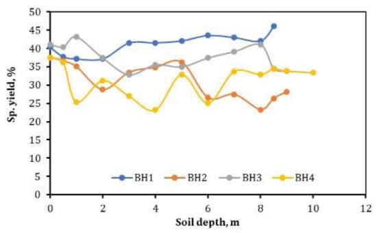 Figure 6 shows the values of specific yield obtained from the four monitoring sites at different depths. As seen in the Figure 6, the specific yield generally varied between 25% and 45%. There was no trend in the variation of specific yield, except in the case of BH1. Most of the specific yield values for BH1 remained high. This could be attributed to variation of grain size, grain shape, sorting and compaction of sediments [44]. Average Sy values for the monitoring sites at BH1, BH2, BH3 and BH4 were 41%, 31%, 38% and 31%, respectively. It is difficult to make direct comparisons between the Sy values obtained in this study with those reported elsewhere in literature due to the differences in soil type, methods of soil collection, methods of Sy determination and geographical differences [47].