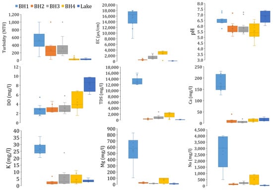 Figure 7 and Figure 8 show the variation in the groundwater quality in all the four boreholes and the lake using box plots and timeseries graphs, respectively. As shown in the box plots (Figure 7), the variations in the cation concentrations appear to be significant particularly for BH1 and BH4, this may be attributed to lateral flow of groundwater due to existing hydro-geological conditions and recharge. While variation in the quality of BH4 groundwater may be attributed to the presence of lake, variation in BH1 groundwater quality may be to the hydro-geological conditions, saltwater intrusion or to the presence of some external contaminant sources. Close observation of Figure 8 indicates that during high rainfall periods, cation concentrations in the lake water appear to drop in comparison to that of groundwater. This reduction appears to be significant in the case of BH2, BH3 and BH4. This may be attributed to the recharge occurring due to the rainfall. Temporal variations as shown in Figure 8 appear to indicate both groundwater and lake water quality is affected by the rainy periods. This again indicate the recharge of groundwater during rainy periods which, in turn, influencing the groundwater quality.