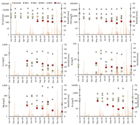 Another important observation that can be made from Figure 8 is that during the rainy periods (September–November 2018) sodium and magnesium concentrations in BH1 groundwater increased. This may indicate some hydrogeological processes that are taking place near BH1 during rainy periods.