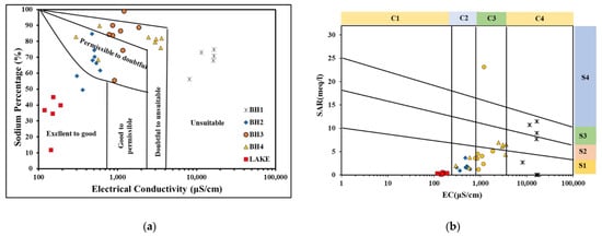 Finally, suitability of BH4 groundwater is classified as C2/C3–S1/S2. The value of S2 can present sodium hazard in fine-textured soils of high cation-exchange capacity under low-leaching conditions but may be used on coarse-textured soils that have good permeability. The implication of its very high conductivity and medium salinity is that it can be used to irrigate plants on coarse-textured soils but under very special circumstances [61]. In the case of BH4 groundwater samples about 80% fell in doubtful to unsuitable category for irrigation purposes and the remainder were in the class of permissible to doubtful (Figure 9a, Table 5).