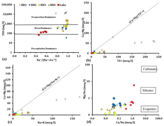 (a) Gibbs’ diagram representing the ratio of (Na+)/(Na+ + Ca2+) as a function of TDS, (b) (Ca2+ Mg2+) vs. TZ+, (c) (Ca2+ + Mg2+) vs. (Na+ + K+), (d) (Mg2+ /Na+) vs. (Ca2+ /Na+).