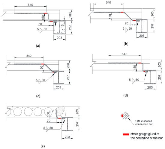 Eleven full-scale specimens were assembled and tested under monotonic in-plane forces until failure. The specimens were divided into two series based on the type of bearing. Series I, which contained seven specimens, was dedicated to investigating end-bearing connections, while Series II comprised four side-bearing specimens. The specimens were constructed using 203 mm thick HCS that were cut to 1220 mm square segments. Each end-bearing specimen consisted of two HCS segments, while side-bearing connections were constructed using one HCS segment. These HCS segments were supported on and connected to a W250 × 67 steel beam using a “Z-shaped”, 10 M steel reinforcing bar as indicated in Figure 3 and Figure 4. On one side, this reinforcing bar was welded to the underside of the top flange of the beam while the other side was grouted to the joint (shear key) between HCS segments.