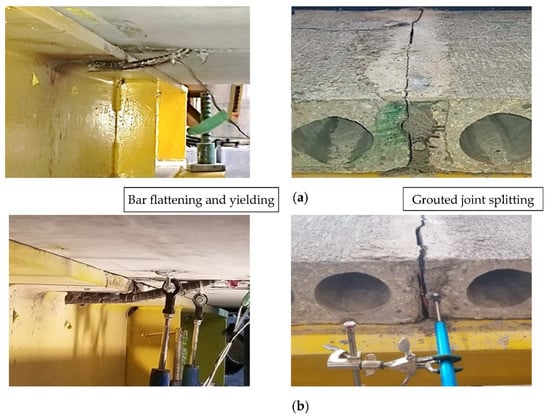 Under tension forces (pulling), the side-bearing specimen with the currently used connection detailing (SB-TN-90) experienced a similar mode of failure to EB-TN-45. After bar yielding and straightening, the grout started to crack, and the specimen failed by grout splitting (Figure 8a). However, the connection bar did not reach the necking stage and the cracking pattern was different from other test specimens. The crack started around the connection bar, but it propagated transversely to the direction of load application across the grouted core towards the top surface of the slab. Finally, the two HCS segments split at the grouted joint.