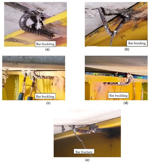 Under compression forces (pushing/CN), the mode of failure of end-bearing specimens was governed by bar bending or buckling at the bottom bend (Figure 7a–d). In general, the connection bar did not yield before the maximum load, except for specimen EB-CN-45R, in which the connection bar developed yielding strains at the bottom bend before bar buckling. The bars were gradually bent or buckled in the direction of the force. While the bars with 90-degree bends in end-bearing specimens (EB-CN-90 and EB-CN-90R) buckled to the front, forming a 180-degree bend shape (Figure 7a,c), the unrestrained portion of the bar in specimen EB-CN-45 bent downwards, as shown in Figure 7b. Then, the slabs gradually pulled the unrestrained (free) portion of the connection bar, provoking “dragging” in the bar. The load started to drop gradually, while the bar experienced further bending or buckling. At 50% of the peak load, bar rupture occurred near the welding in specimens EB-CN-90 and EB-CN-90R. For specimen EB-CN-45, no bar rupture was observed after the slabs were displaced excessively (56.8 mm). No cracking was observed in the slabs or the grouted shear key at any point during the test of these specimens.