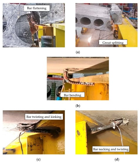 The load direction, pulling or pushing, applied normal to the supporting beam resulted in different modes of failure in the connection bar. Under tension forces (pulling), the Z-shaped bar failed by steel yielding at the unrestrained portion of the bar near the bend, followed by grout splitting. In addition, the bottom bend of the connection bar straightened and elongated, regardless of the bend angle (Figure 6a,b). The end-bearing specimen with a 45-degree bent bar (EB-TN-45) exhibited bar yielding and later, bar necking (Figure 6b). Afterwards, a single crack appeared at the grouted joint above the connection bar for both specimens tested under a normal pulling force. In contrast, the end-bearing specimen with a 90-degree bent bar (EB-TN-90) experienced an early cracking due to bond failure between the HCS and the grouted shear key (Figure 6a).