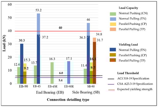 The expected load capacity of 10 M steel bars with a nominal yield strength of 400 MPa is 40 kN given that the bar cross-sectional area is 100 mm2 and no material resistance factor is applied. Typically, a 10 M connection bar is installed in every grouted shear key of the slabs, resulting in a tie spacing of 1.22 m for HCS and thereof, an expected capacity of 32.8 kN/m in tension (corresponding to the yielding load of the bar). North American design codes [4,5] specify a minimum capacity in tension for integrity ties of 5.0 and 4.4 kN/m of supported slab length, respectively. If the connection bar can develop the expected nominal tensile yielding strength, as the code intent, the connection capacity would be 6.6 times larger than the specified values given a spacing of 1220 mm. Figure 9 depicts the capacity for all test specimens, as well as the yielding load, if applicable. The threshold of expected capacity based on the connection bar properties and the above-mentioned code limits are also indicated in Figure 9.