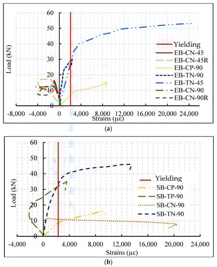 Under compression (pushing) forces, the connection bars exhibited an initial linear elastic load-compressive strain behavior, until the onset of bar buckling. Afterwards, the strains significantly increased while the load did not change or gradually dropped, as a result of the bar bending. Finally, the load decreased while the bar suffers further distortion as a result of “dragging” (Figure 10a). For specimens with 45-degree bent bars (EB-CN-45 and EB-CN-45R), the length of the unrestrained bar at the bottom bend in end-bearing connections affected the load-strain behavior. At the peak load, the connection bar in specimen EB-CN-45 attained −1000 µε at the bend. After this point of loading, strength degradation was observed along with strain reduction. In contrast, reducing the unrestrained length of the bar in specimen EB-CN-45R delayed the onset of bar buckling and strength degradation at the bottom bend due to the bar leaning against the top flange of the supporting beam. After the linear elastic stage with compressive strains, the connection bar yielded while buckling near the flange of the supporting beam (Figure 7d). This connection bar maintained the peak load almost steady until approximately −3360 µε. Finally, a drop in the load with increasing tensile strains was observed. However, specimens with 90-degree bar bends tested under compression (EB-CN-90 and EB-CN-90R) had no significant difference in their load-strain behavior. At the maximum load, the measured strain in the connection bar in EB-CN-90 and EB-CN-90R, were −1050 and −1460 µε, respectively.