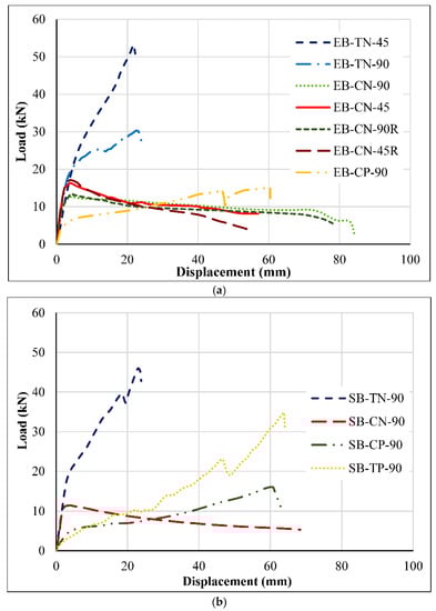 In contrast, the side-bearing connection (SB-TP-90) under pulling exhibited a steeper load–displacement curve before failure compared to its counterpart tested under a pushing force (Figure 11). Initially, this specimen had a linear-elastic stage followed by a load drop at the onset of the bar twisting. Finally, the load capacity was reached at a displacement of 63.8 mm.