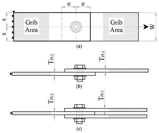 Figure 4 shows the basic geometric characteristics of single and double-lapped joints as seen in Figure 4b. Generally, the single-lapped joint consists of two plates and the double-lapped joint consists of three plates as seen in Figure 4b,c. Parameters such as the edge distance (e), width (W), side distance (S), and plate thicknesses (TPL1 and TPL2) control the behavior and failure mode of the joints.